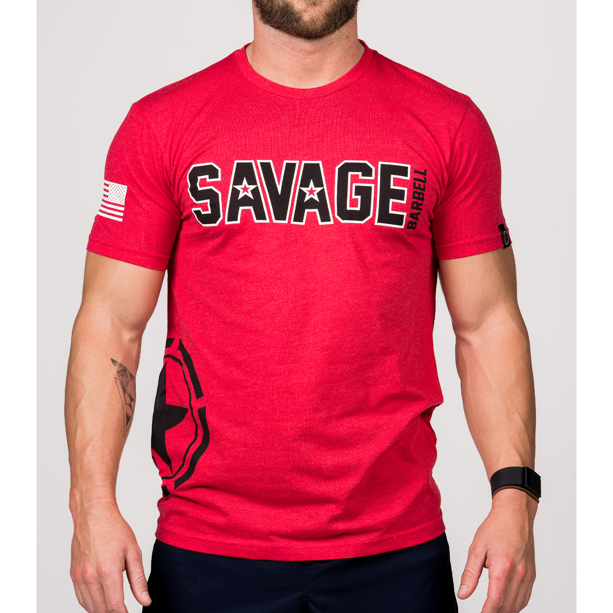 Rock this red workout shirt's Savage Star on your hip as it sways side to side. Stay Savage with this men's star shirt.